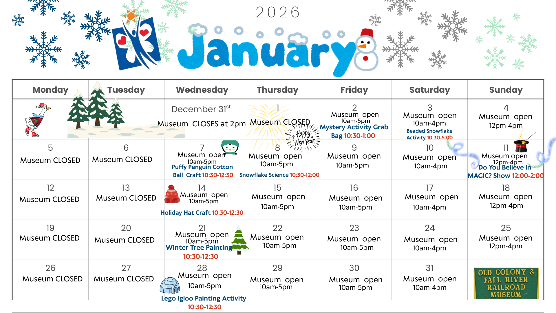 JANUARY 2026 CALENDAR Thursday, January 1, 2026 12:00 AM Saturday, January 31, 2026 12:00 AM Google Calendar ICS OUR SPECIAL JANUARY FEATURED EVENT IS OUR “DO YOU BELIEVE IN MAGIC?” SHOW! WE ARE OPEN ON NEW YEAR’S EVE FROM 10:00AM-2:00PM AND CLOSED ON NEW YEAR’S DAY! HAPPY NEW YEAR!